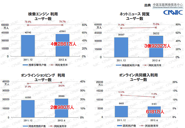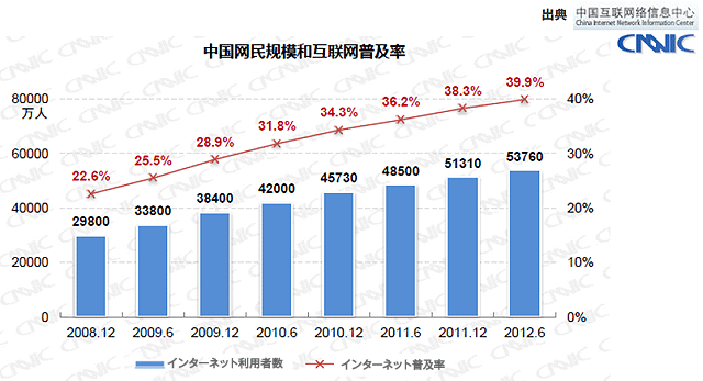 中国のインターネットユーザー数は5億人を超える世界最大の市場で、Facebook人口も47万人を超えています。利用者の多くは、北京、広東等の大都市に利用者が集中し、大卒以上の高学歴を有しているものが大部分を占めています。また、現在の普及率は全人口の38%にしか満たないため、今後のインターネット人口の拡がりが期待されます。