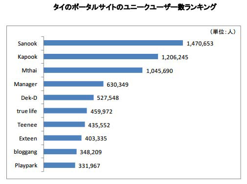 タイポータルサイトのアクセスランキングを見てみると、「Sanook」、「Kapook」、「Mthai」とローカル言語のサイトが続きます。