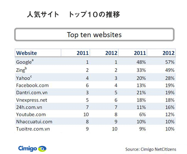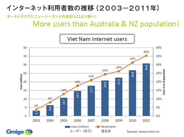 ベトナムのインターネット利用者数は、2011年現在3000万人を超え、オーストラリアとニュージーランドの総人口よりも多い。普及率は35%。