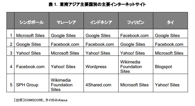 シンガポールやインドネシアは地場のサイト(シンガポール:SPH Group、インドネシア:Wordpress)がトップ 5 に入っている。