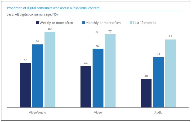 しかし、「定期的にアクセスしているか」については、「オーディオ」よりも、「ビデオ」にアクセスしている割合が高い。