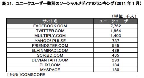 主要サイトの動向については、上位は Facebook や Twitter が入っており、それ以外にも、FRIENDSTER というテレビゲ