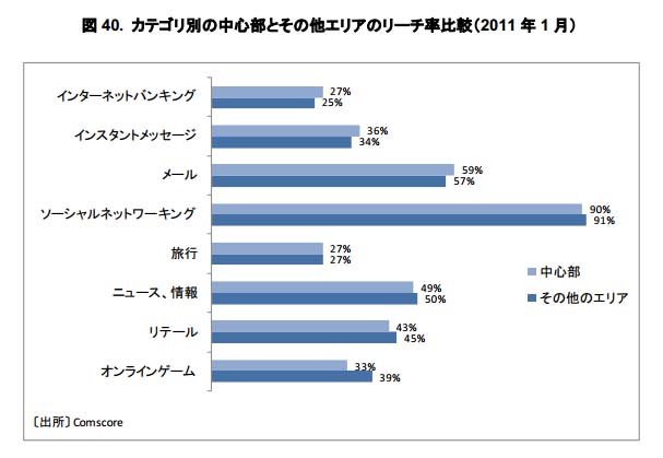 中心部に住む利用者はその他のエリアに住む利用者に比べ、若干ながらインターネットバンキング、インスタントメッセージ、メールの炉用が多く、その他エリアの利用者は、ニュース・ショッピング・ゲームが中心部に住む利用者より多いといえる。