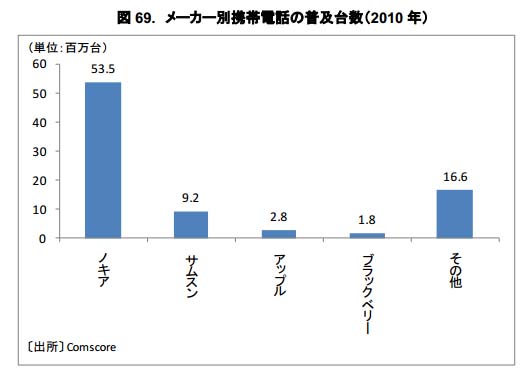 携帯電話機器の中で最もシェアが高いのはノキアで、64%の圧倒的なシェアを確保している。
