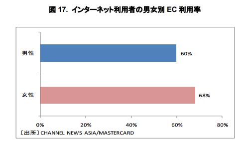 シンガポールのネットユーザーの 64%は EC を利用しており、男女比率では女性が 68%と男性の60%に比べて高くなっている。
