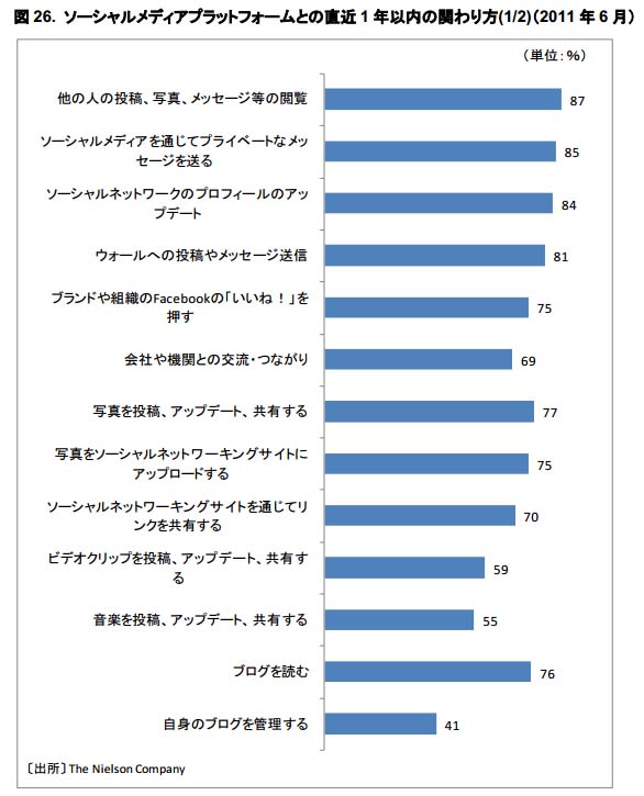 「ソーシャルネットワークのプロフィールのアップデート(84%)」も利用方法として多く、ソーシャルネットワーク上での積極的な交流に加え、自身のプロフィール情報の更新も積極的に行われている。