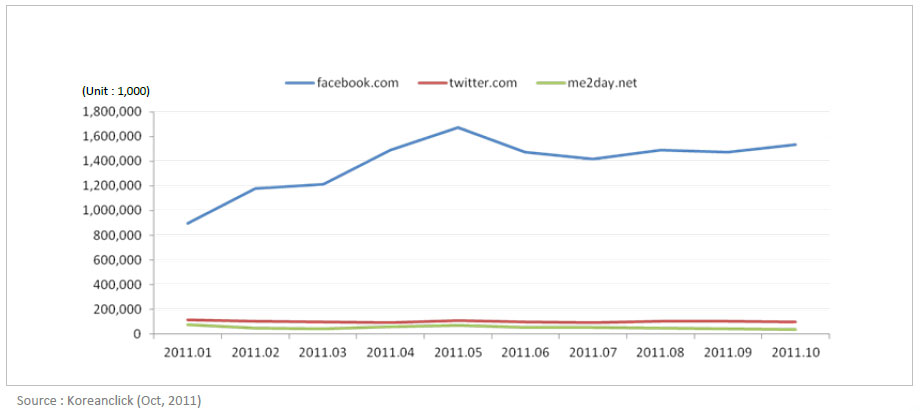 青色 : フェイスブック、 赤色 : ツイッター、 緑色 : ミートゥデイ