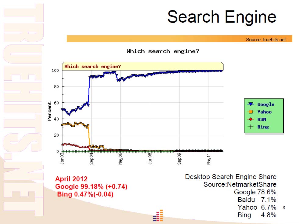 * デスクトップでの検索エンジンシェア : Google ( 78% )、 Baidu ( 7% )、 Yahoo! ( 6.7% )、 Bing ( 4% )