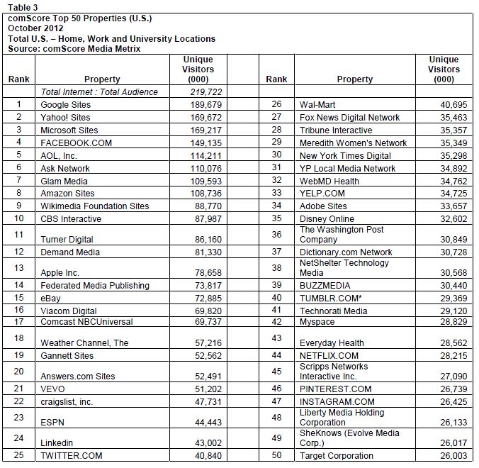対象 : アメリカの人口 自宅、職場、学校からのアクセス (コムスコア調べ)