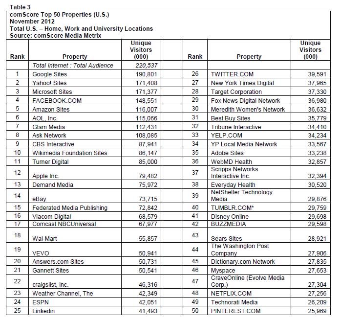 * Googleは、2012年11月の1ヶ月間に、1億9,100万人の訪問者がおり、ランキング第1位となった。