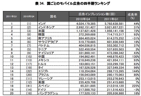ホーム > 海外ネット関連ニュース> ランキング - モバイル広告 国別 (世界全体)