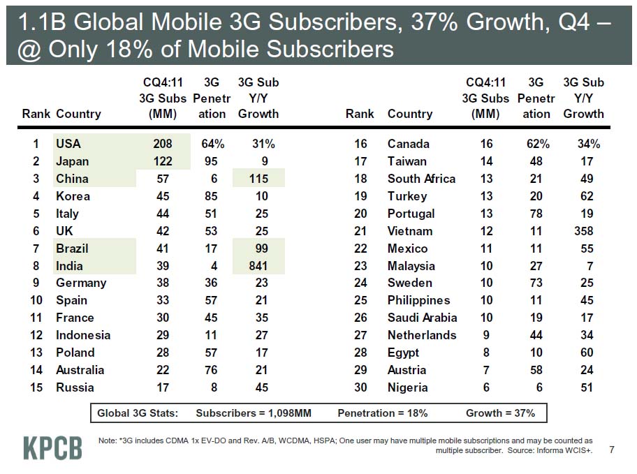 項目 : ①ランキング、 ②国名、 ③2011年第4四半期の3G 利用者 (+100万人)、