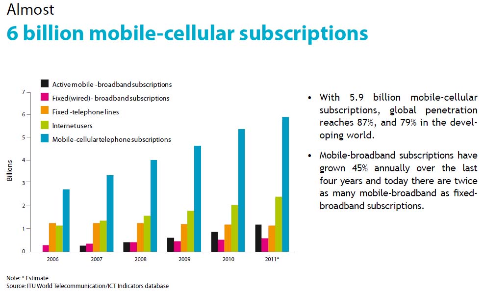 世界全体の携帯電話利用者は、59億人で、87%の普及率。新興国については、79%の普及率。