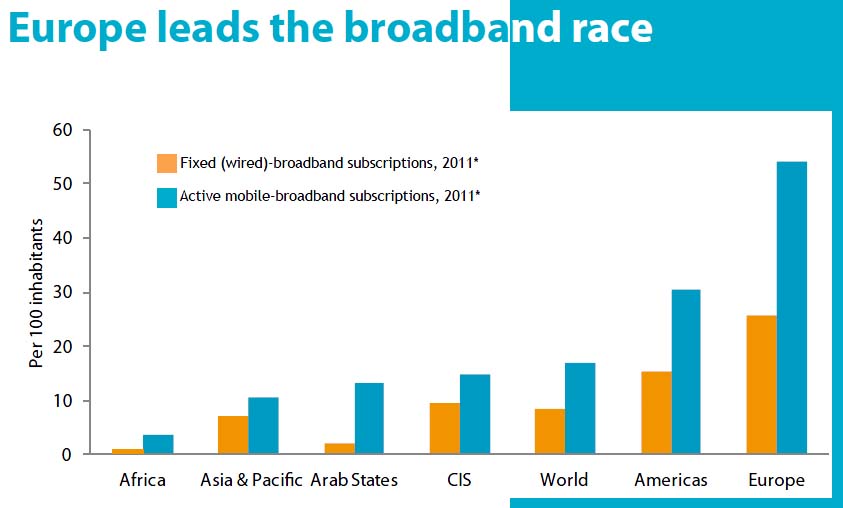 ヨーロッパでは、ケーブル・インターネットが26%で、モバイル・インターネットが54%の普及率。