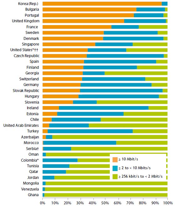 * 韓国のインターネットは、10Mbit / s以上あるが、その一方、ガーナ、モンゴル、オマーン、ベネズエラでは2Mbit / s以下で、スピードは限られている。