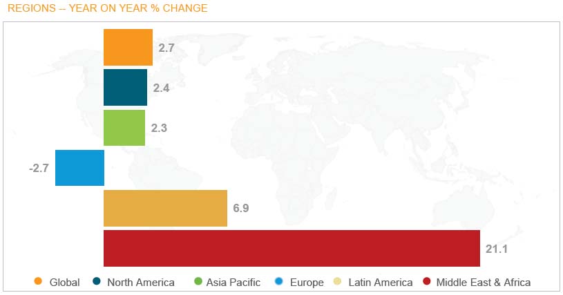 南米の新興国では、6.9%上昇、中東とアフリカでは21.1%上昇。