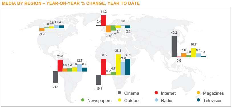 ホーム > 海外ネット関連ニュース> 広告費 昨年からの増減 ― 媒体、地域別 (世界全体)