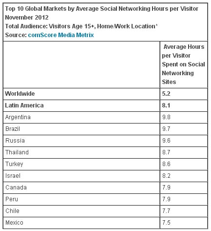 ホーム > 海外ネット関連ニュース> ランキング - SNS 利用時間 (南米 ・ 他)